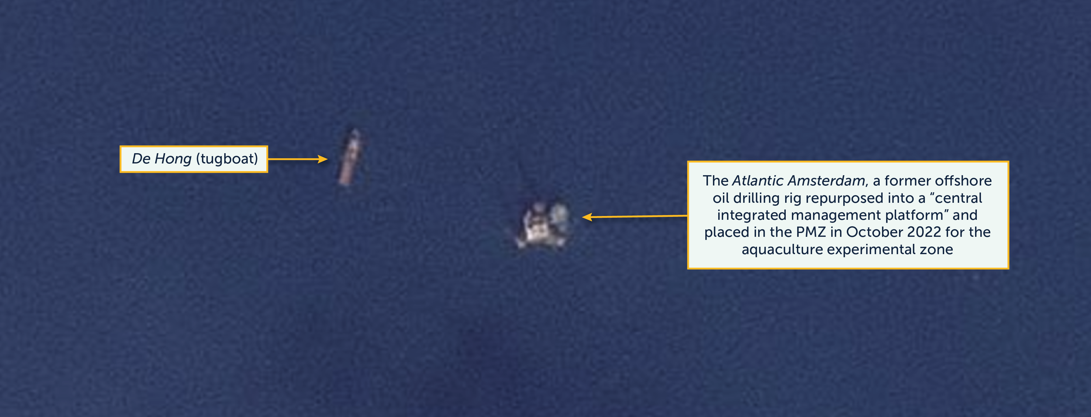 - Our analysis finds the platform under tow by the De Hong, a Chinese tugboat broadcasting AIS signals and moving north towards the PMZ boundary with the ultimate destination as yet unknown.