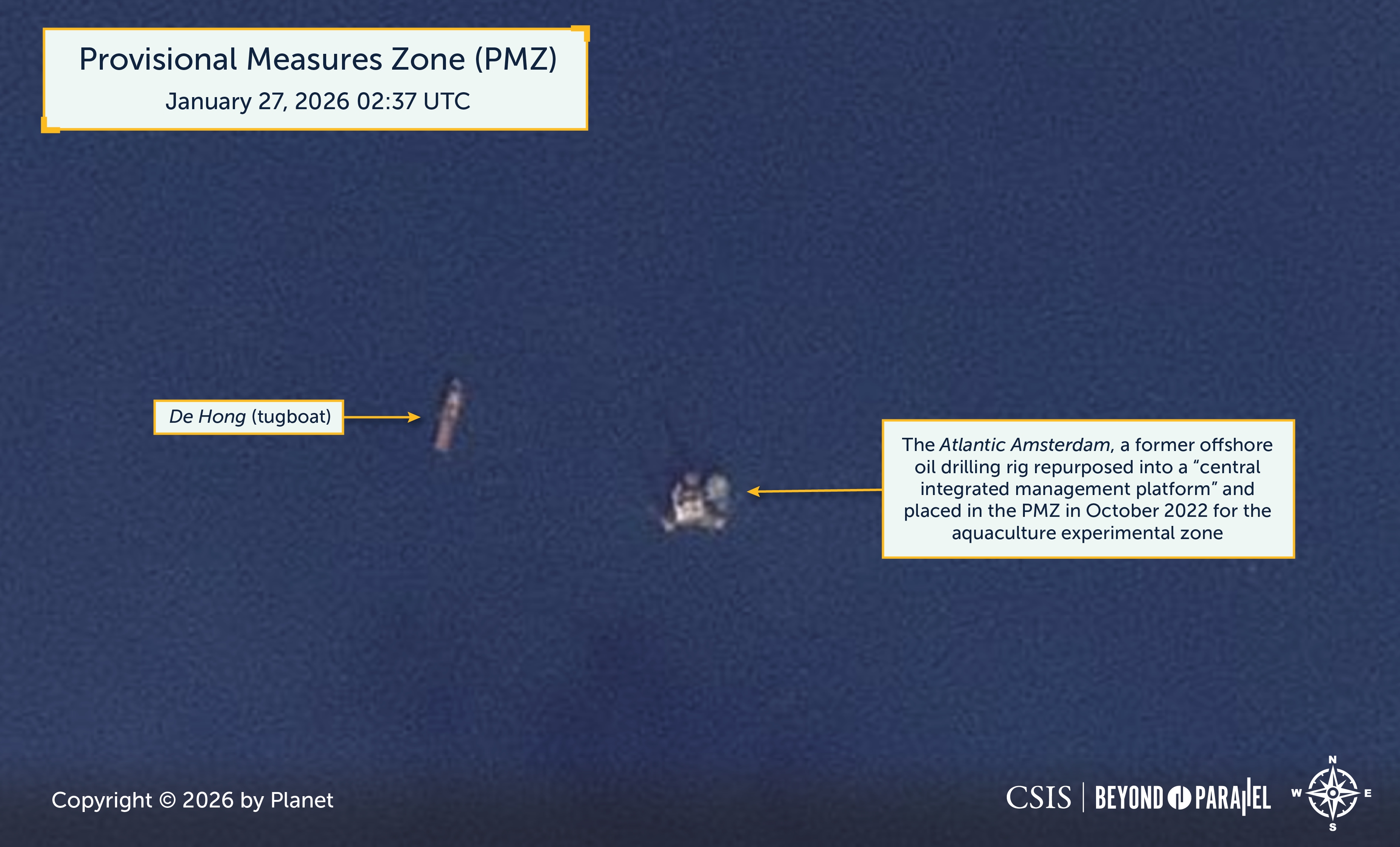 - CSIS imagery analysis and AIS data collection finds that China has begun relocating the Atlantic Amsterdam from inside the Provisional Measures Zone (PMZ) on January 27.