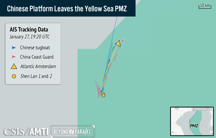 Earlier on January 27, the South Korean and Chinese governments confirmed that China would relocate the Atlantic Amsterdam, a maritime management platform located within the Provisional Measures Zone, later that day. South Korean officials added that the structure was being moved “out of the PMZ and toward Chinese land,” and that the decision to do so “reflected both sides’ natural consensus’ that the management structure was the most sensitive.”1