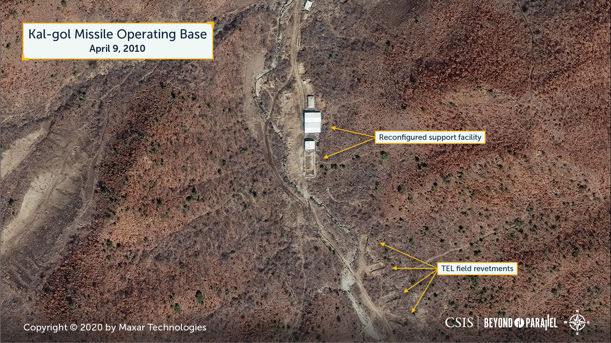 - It may be that elements of the Kal-gol Scud ballistic missile unit were provisionally based in these areas before moving into the base itself. ↩