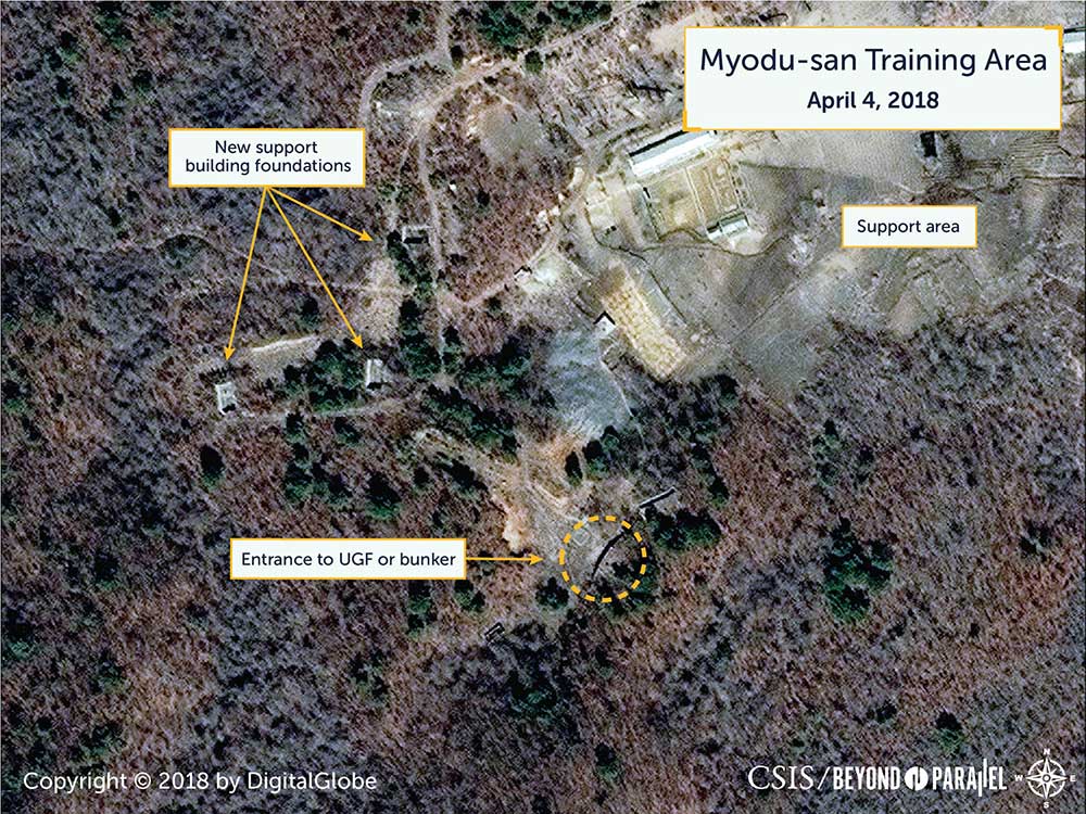 Limited historical satellite imagery suggests that there are three additional UGF or bunker entrances of varying sizes within the facility and at least six in the immediate surrounding areas. Several appear large enough to accommodate Nodong TEL/MELs, reload vehicles or technical vehicles.